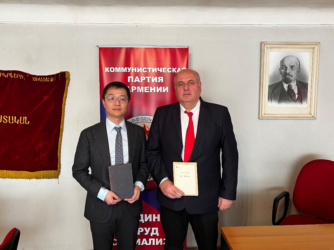 12日,在中国驻亚美尼亚使馆的支持下,郑云天赴亚美尼亚共产党总部考察,与亚美尼亚共产党第一总书记加扎扬亲切交流。加扎扬赠送给郑云天一本1938年出版的亚美尼亚语《共产党宣言》,并表示真诚希望同中国共产党进一步加深相互了解与合作。