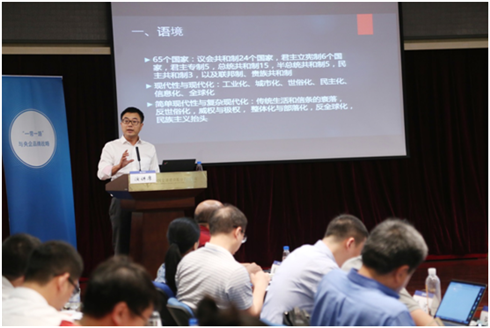 上半场首先由北京大学国际关系学院查道炯教授发表主题演讲《国际地缘经济格局中的“一带一路”:央企的机遇与挑战》,他把“一带一路”战略纳入全球地缘经济格局之中,指出了中央企业在跨国经营中的政治风险,以及如何把握政治风险,提出必须有效应对国际间有关中资企业的舆论风险。