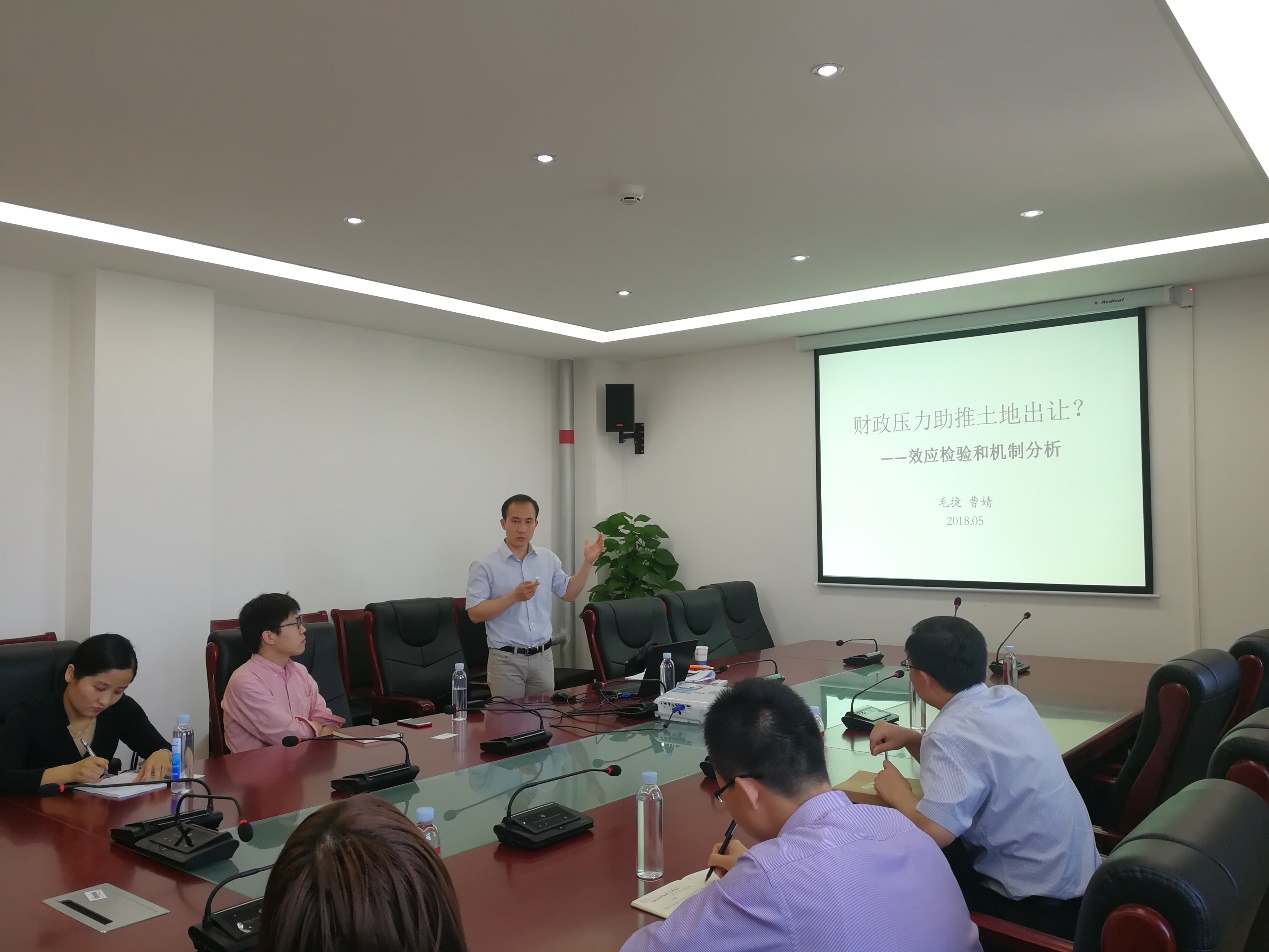 本次研讨会上,毛教授介绍了他的研究《财政压力助推土地出让——效应检验和机制分析》。研讨会开始,他指出,对于财政压力能否解释土地出让收入持续增长,学术界存在激烈争论。他的文章利用1999—2014年中国地级市层级数据,使用取消农业税改革造成的财力紧缩冲击识别财政压力,构建强度双重差分模型实证检验财政压力对土地出让的影响。研究发现,财政压力是造成土地出让收入规模持续扩大的重要原因。进一步的机制分析表明,土地出让收益的提高会增强财政压力对土地出让的刺激效应,而土地出让成本的增加和税收收入对土地出让收入的替代则会抑制上述刺激效应。